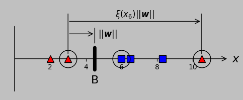 In the support vector machine context, we might decide deliberately to allow misclassification while quantifying the degree of allowed misclassification through so-called slack variables \(\xi_m=\xi(x_m)\), which characterize the distance from the problematic point to the border of the correctly classified points in that group (represented here by the distance from \(x_6\) to the nearest correctly classified point in the –1 class, \(x_2\)):