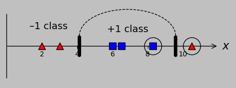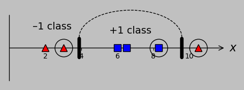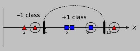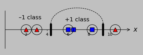 Then, we made the conditions more general by introducing another point in class –1 that precluded the use of a single threshold to separate the data: