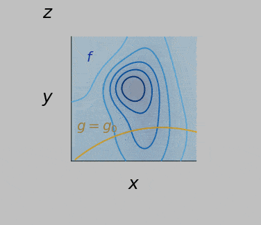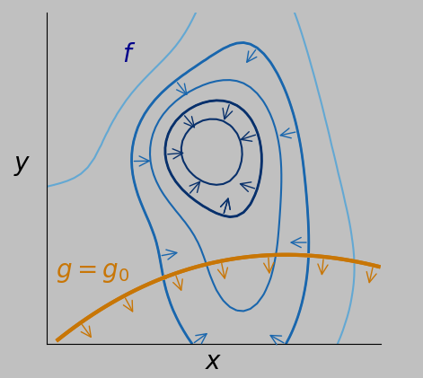 We seek the largest value of \(f\) (shown in blue, with contour loops that get darker with increasing \(f\)) with the constraint that we must stay on the orange planar curve corresponding to the constraint \(g=g_0\).