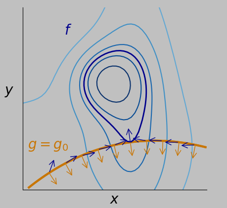 Arrows show the directions of the gradients of \(f\) (blue arrows) and \(g\) (orange arrows) at various points on the constraint \(g=g_0\) (orange curve). The point we seek—which lies on the special contour in dark blue—is the one on the constraint (orange line) where the gradient of the constraint is parallel to the gradient of \(f\). It's at this point that \(f\) is maximized while satisfying \(g=g_0\). This approach provides a systematic way to achieve our objective.