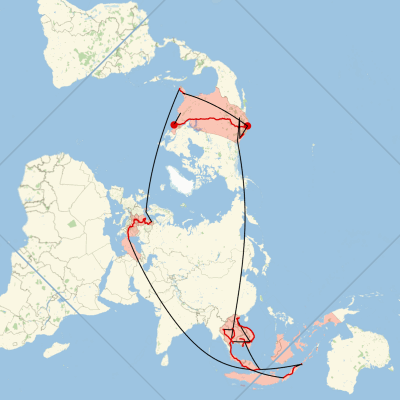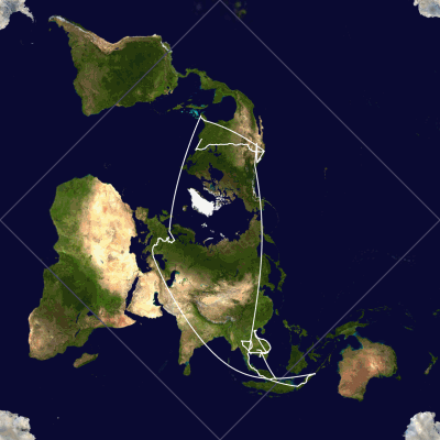 Finally, we add a darker blue equator, highlight beginning and end points, transform all the coordinates from equirectangular to Peirce quincuncial, assemble the composite image, and crop out latitudes we didn't visit: