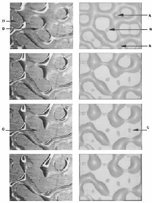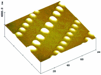 micrographs) seem to be caused by the out-of-plane component of the surface tension of drying droplets. Our attempts to reproduce the phenomenon in the lab were only partly successful; experiments with drying fluids led to features, but never those as varied as the examples shown above. We therefore still don’t fully understand the details of the mechanism. Fortunately, the features do not affect the operation of the